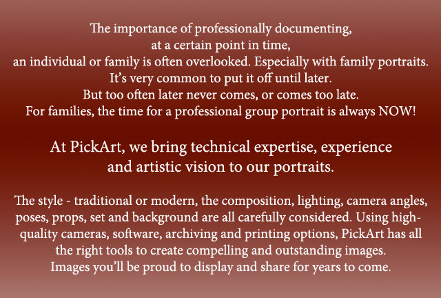 A portrait is a moment in a life captured forever. When it also holds stories beyond the surface image of the person, suggesting the unique set of experiences that shaped their life and brought them to this moment in time, and portrays a sense of the character and essence of the individual, it becomes more than just a photograph. It becomes art PickArt brings quality to you every time. A quality professional portrait is a valuable treasure that can be enjoyed down through the years, and passed on as a family heirloom.